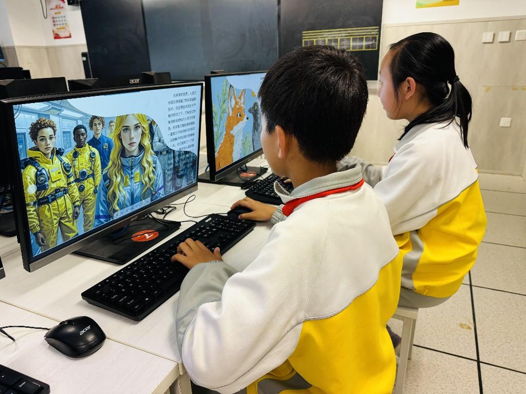记者看到,在课堂上,小创作者们先用文字构思故事,再通过AI工具生成视频,最后用语音合成技术为角色配音,完成从文字到多媒体绘本的全流程创作。